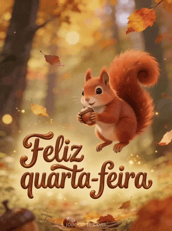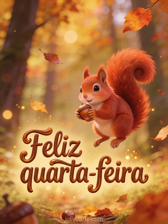 Envie uma saudação adorável de feliz quarta-feira com um esquilo ruivo e fofo segurando uma avelã, com a cauda espessa enrolada na luz quente da floresta de outono. Veja também feliz quarta-feira gif animado, todos os dias penso em você yosa prod ou coração coração ternura feliz quarta-feira beijinhos.