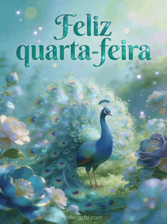 Envie uma saudação elegante de feliz quarta-feira com um pavão majestoso exibindo suas penas iridescentes em um jardim real com flores ornamentais. Veja também um feliz quarta-feira buquê, um feliz quarta-feira beijos gif animado ou um feliz quarta-feira gif de gato.