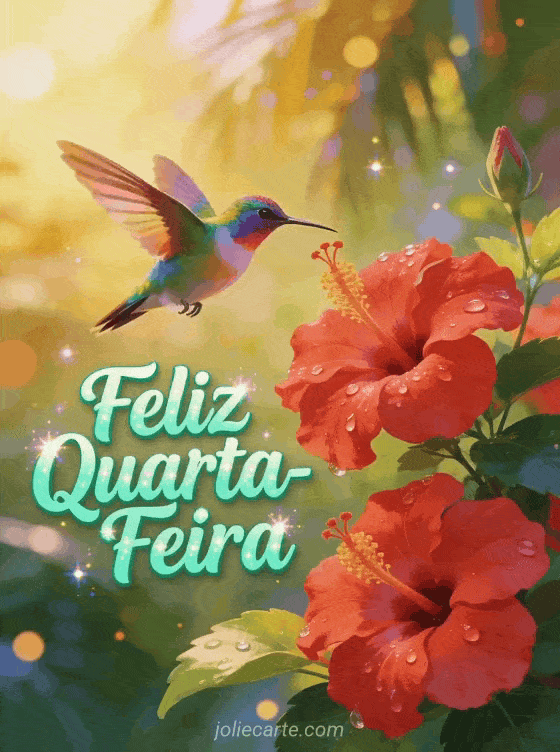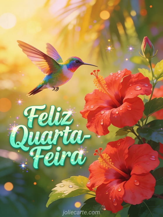 Compartilhe esta linda imagem de feliz quarta-feira com um beija-flor colorido voando perto de flores de hibisco vermelhas banhadas pela luz dourada do sol. Um cartão vibrante e tropical perfeito para alegrar a quarta-feira de alguém especial. Descubra também um cartão de bom dia quarta-feira ou um cartão de feliz quarta beijos.