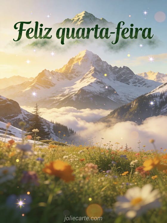 Envie uma saudação tranquila de feliz quarta-feira com picos alpinos nevados, uma campina de flores silvestres e luz dourada da manhã sobre nuvens flutuantes. Veja também imagens animadas feliz quarta-feira, bom dia é quarta-feira ou bom dia minha linda quarta-feira.