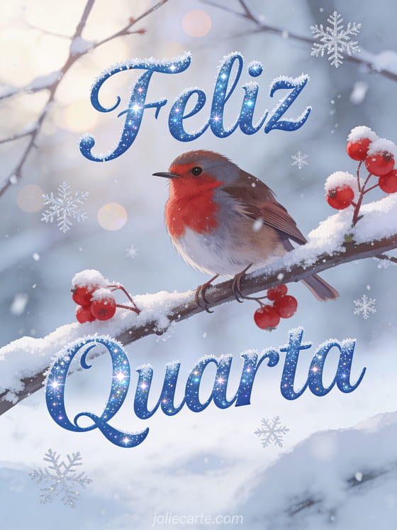 Compartilhe uma serena saudação de quarta-feira de inverno com este tranquilo cartão com um encantador pintarroxo em um galho nevado com frutas vermelhas. Descubra também boa quarta-feira ou sms para dizer feliz quarta para mais inspiração.