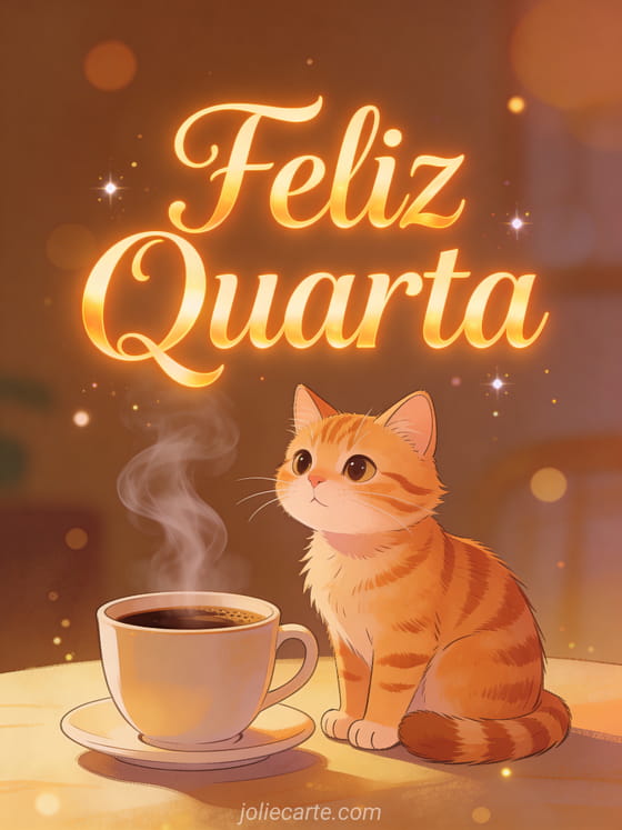Aqueça sua quarta com este cartão aconchegante. Um gato rajado fofo sentado ao lado de uma xícara de café fumegante em tons de caramelo com clima acolhedor de manhã. Descubra também um cartão de feliz quarta ou um cartão de bom dia feliz quarta.