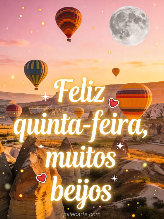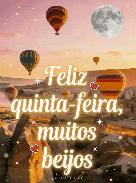 Envie feliz quinta-feira beijos gifs animados com letras cursivas brancas luminosas, halos dourados, corações vermelhos e balões de ar quente coloridos ao nascer do sol na Capadócia. Compartilhe um desejo romântico durante a semana e veja também feliz quinta-feira cartão bonito, feliz quinta-feira gif ou bom dia feliz quinta-feira esporte imagem.