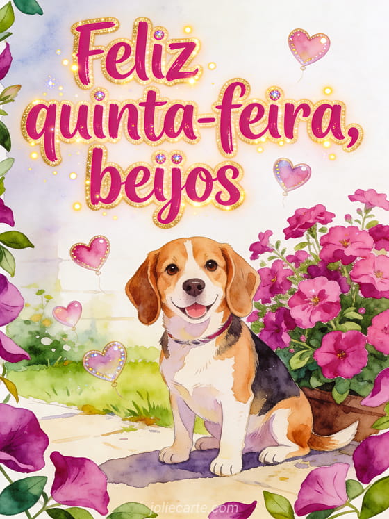 Compartilhe beijos de feliz quinta-feira com um cachorro beagle alegre em um canto claro do jardim, flores fúcsia e enfeites de coração flutuantes. Você também pode compartilhar feliz quinta-feira gif animado, feliz quinta-feira imagens de corações ou feliz quinta-feira sol imagem.