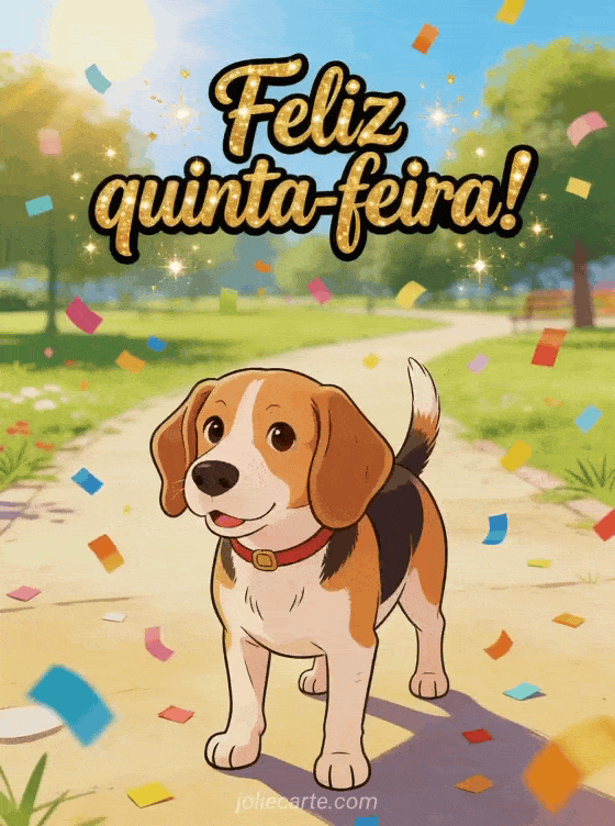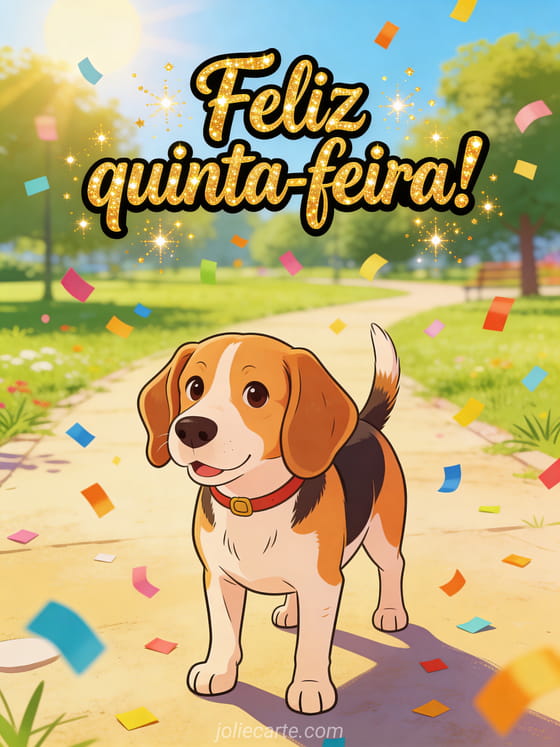 Envie uma saudação alegre de feliz quinta-feira com letras dinâmicas, brilhos dourados, um cachorro beagle brincando em um parque ensolarado e detalhes de confete colorido para um clima luminoso de cartão. Veja também este feliz quinta-feira gato gif, este feliz quinta-feira cartão virtual ou estas feliz quinta-feira mulher imagens.