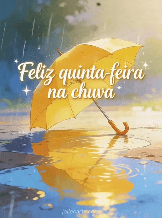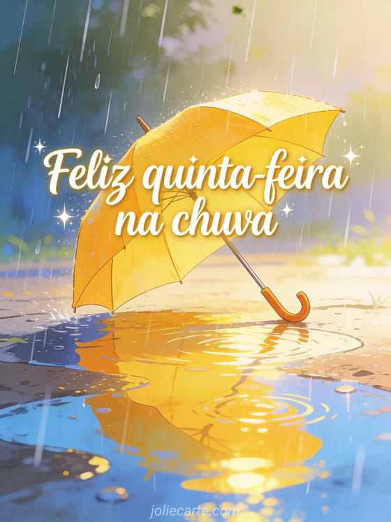 Compartilhe feliz quinta-feira na chuva com cursiva suave, brilho delicado, um guarda-chuva amarelo sob chuva viva, reflexos brilhantes nas poças e luz calorosa aconchegante. Veja também cartões para desejar uma feliz quinta-feira, belas imagens animadas feliz quinta-feira ou bom dia feliz quinta-feira.