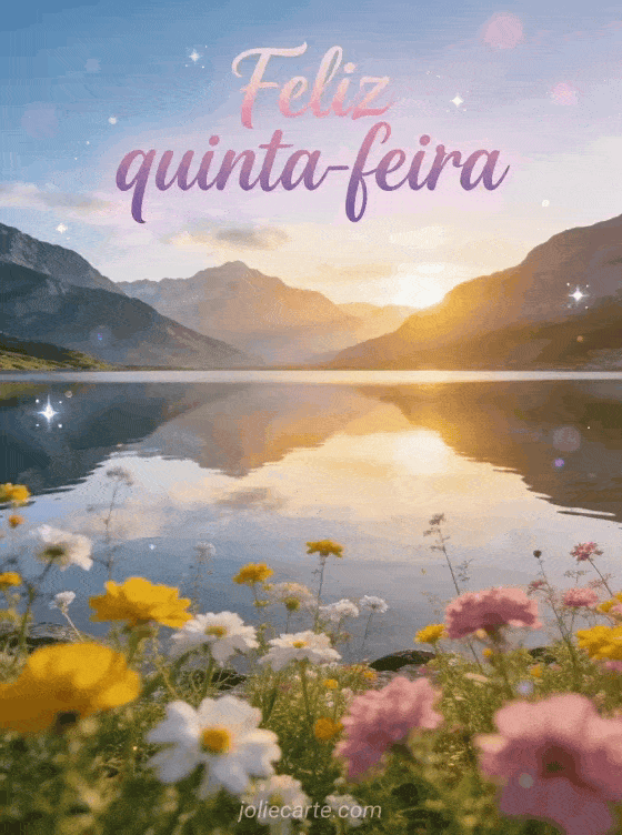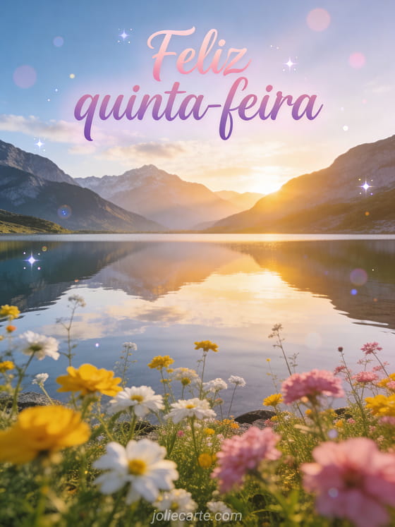 Envie uma saudação tranquila de feliz quinta-feira com caligrafia moderna, um lago de montanha sereno ao nascer do sol, reflexos espelhados e flores silvestres em primeiro plano. Veja também feliz quinta-feira minha amiga, feliz quinta-feira imagens ou quinta-feira bom dia.
