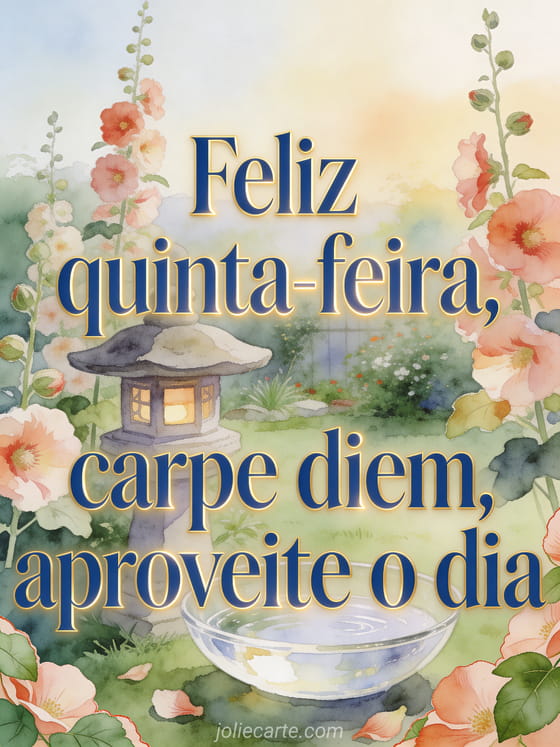 Compartilhe uma feliz quinta-feira tranquila com um jardim em aquarela, malvas-rosas ao redor de uma lanterna de pedra e uma tigela de água clara. Você também pode compartilhar feliz quinta-feira texto, feliz quinta-feira meus amigos imagens ou feliz quinta-feira amigos poema.