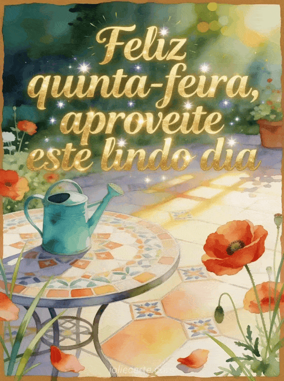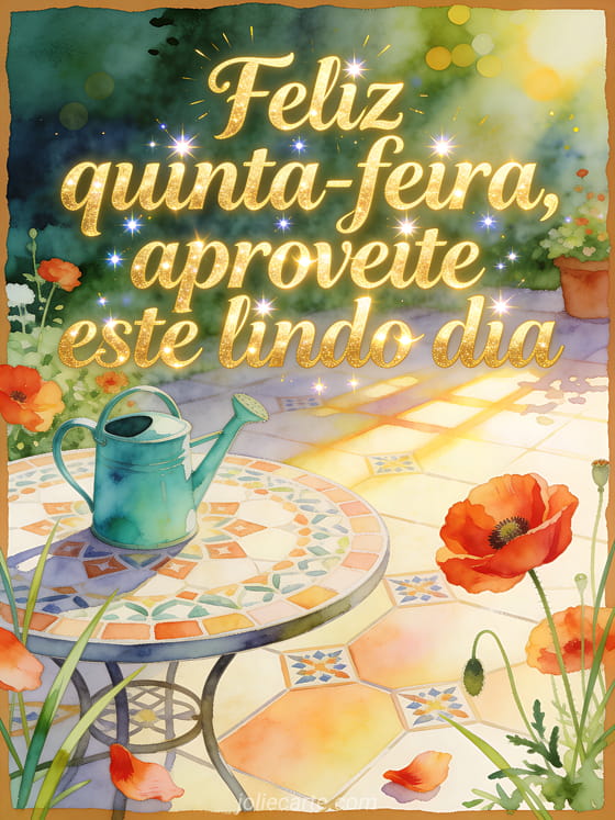 Deseje uma linda quinta-feira com uma mesa de jardim luminosa, um regador turquesa, papoulas intensas e raios de sol sobre azulejos estampados. Veja também imagens para boa quinta-feira, um feliz quinta-feira poema ou uma boa quinta-feira bênção.