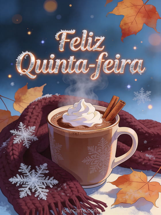 Aqueça uma fria quinta-feira com este aconchegante cartão com uma xícara fumegante de chocolate quente com canela e cristais de geada em folhas de outono. Descubra também foto feliz quinta-feira ou bom dia de quinta-feira.