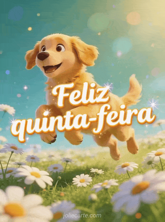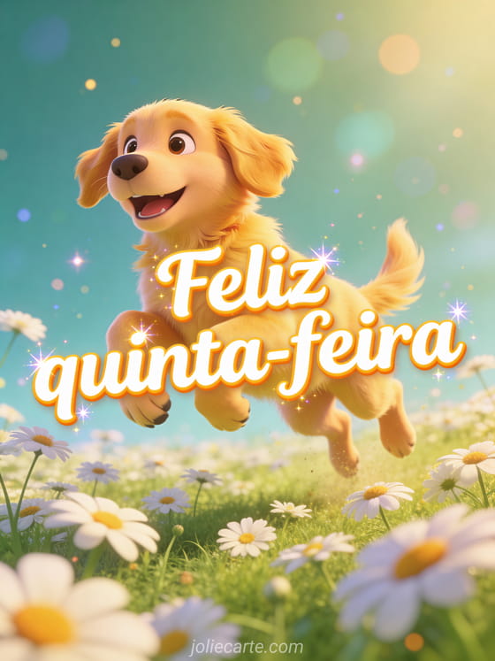 Envie uma saudação alegre de feliz quinta-feira com um filhote golden retriever brincalhão saltando por um campo de margaridas em um clima ensolarado. Veja também bom dia feliz quinta-feira esporte imagem, feliz quinta-feira chuvosa gif ou cartões para desejar uma feliz quinta-feira.
