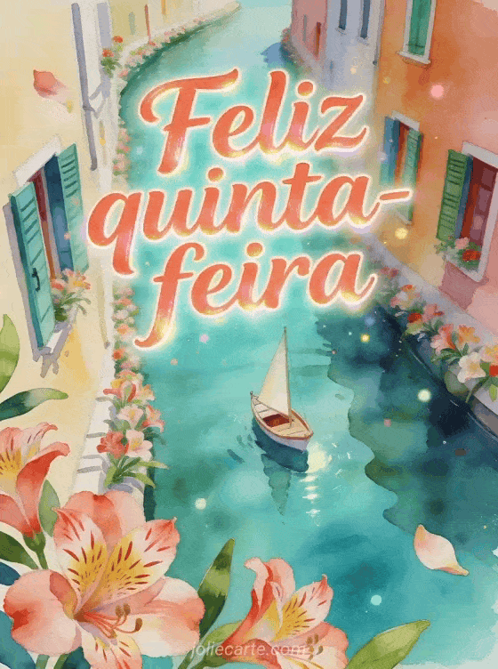 Envie um desejo alegre de quinta-feira com letras coral, uma cena de canal, um pequeno veleiro, venezianas pintadas e pétalas de alstroeméria cruzando a borda. Veja também bom dia feliz quinta-feira beijos imagens, uma bom dia feliz quinta-feira citação ou um texto para desejar uma feliz quinta-feira.