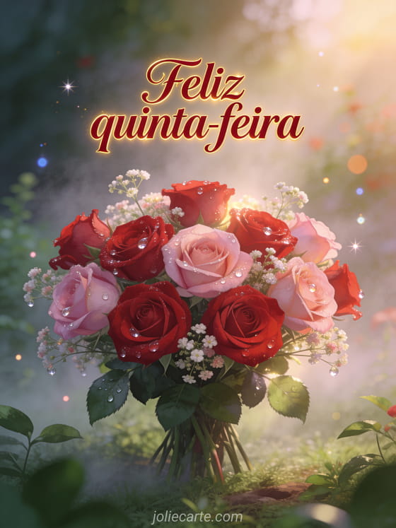 Envie uma linda saudação de feliz quinta-feira com rosas vermelhas e rosadas, orvalho brilhante e uma luz dourada acolhedora. Veja também feliz quinta-feira positiva, bom dia feliz quinta-feira gif ou bom dia e bom dia de quinta-feira.