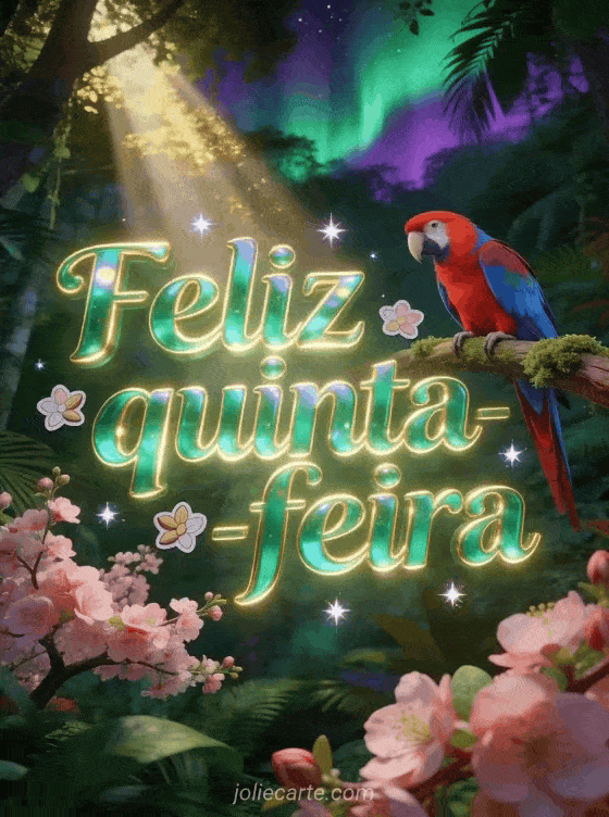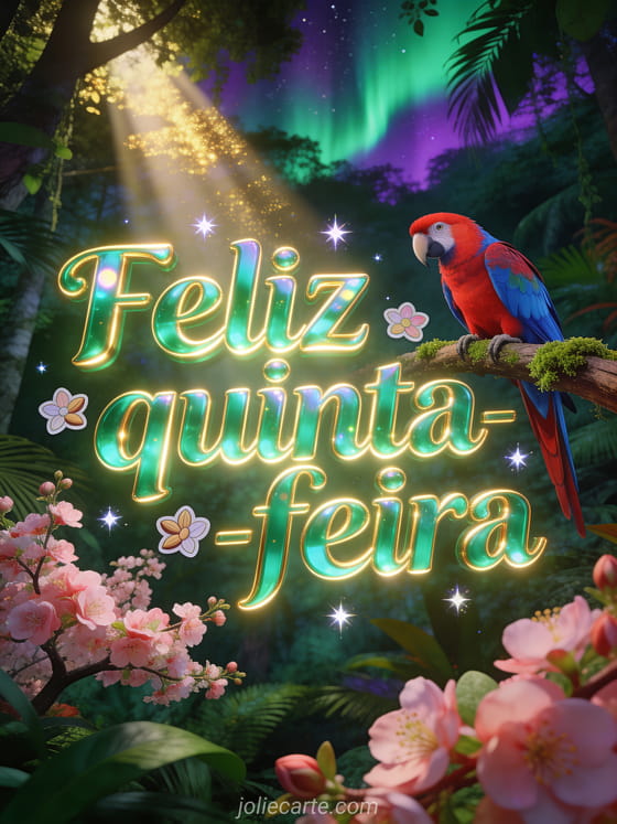Envie um cartão de feliz quinta-feira com letras esmeralda, flores de amendoeira, estrelas brilhantes e uma arara vermelha e azul em uma floresta tropical sob uma aurora verde e violeta. Veja também um pensamento positivo positivo feliz quinta-feira citação, um bom dia de quinta-feira imagens ou um feliz quinta-feira imagens com rosas.