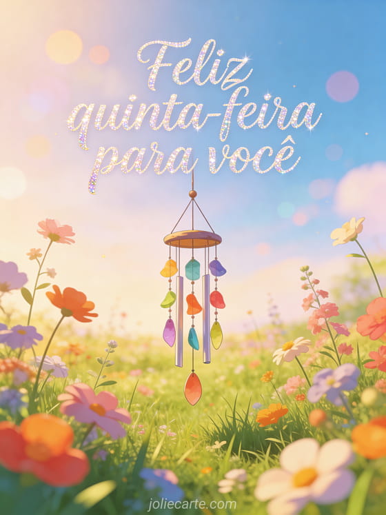 Compartilhe feliz quinta-feira para você com cursiva fluida, brilho sutil, uma campina primaveril colorida, um sino dos ventos pendurado, luz da manhã e bokeh suave. Veja também quinta-feira bom dia, bela imagem para dizer feliz quinta-feira ou feliz quinta-feira citação imagens.