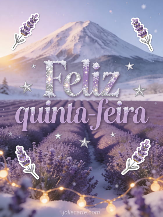 Envie feliz quinta-feira mulher imagens com letras elegantes violeta lavanda, reflexos prateados gelados e um campo infinito de lavanda diante de uma montanha nevada. Compartilhe um desejo poético durante a semana e veja também bom dia quinta-feira imagens, imagem para desejar uma boa quinta-feira ou imagens de beijos de quinta-feira.