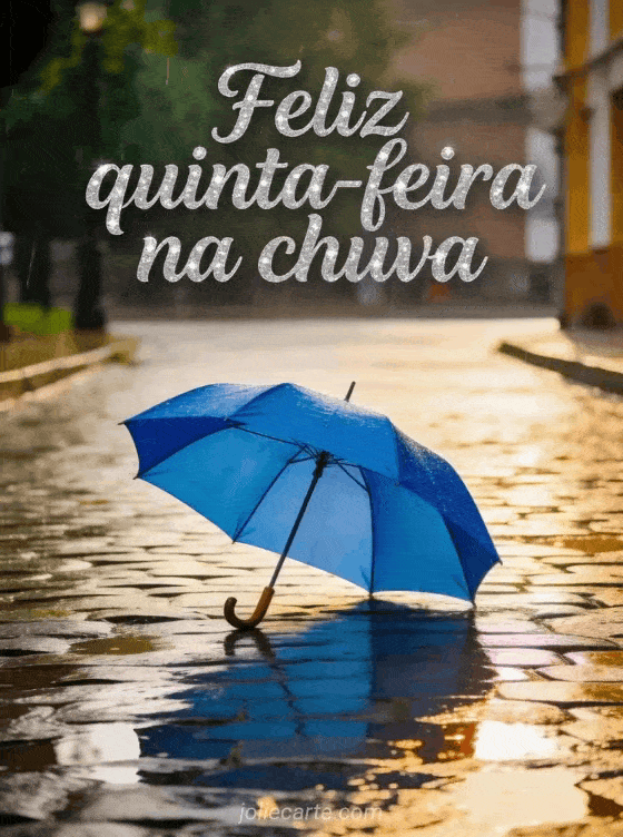 Compartilhe uma imagem de feliz quinta-feira na chuva com texto prateado, um guarda-chuva azul sobre paralelepípedos molhados e reflexos luminosos. Você também pode enviar feliz quinta-feira beijos gifs animados, um feliz quinta-feira cartão bonito ou feliz quinta-feira tenha um bom dia.