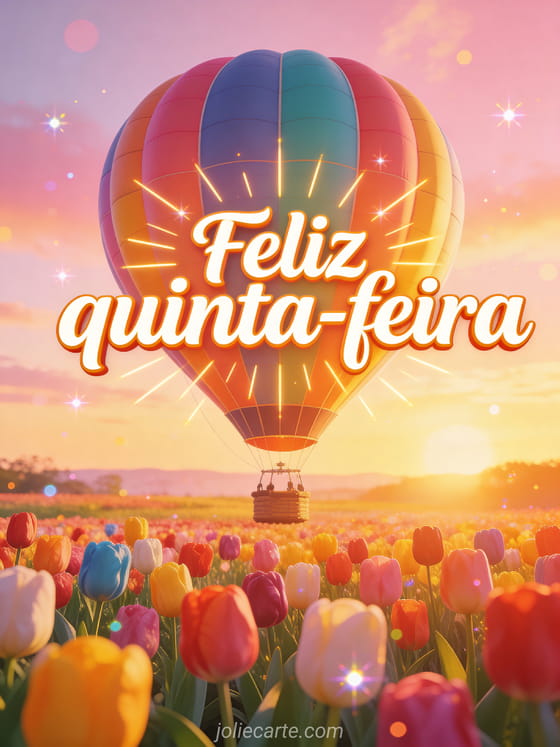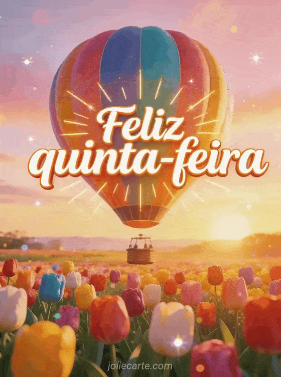 Compartilhe uma feliz quinta-feira positiva com um balão de ar quente vibrante sobre tulipas coloridas ao nascer do sol. Continue espalhando bom humor com bom dia feliz quinta-feira gif, bom dia e bom dia de quinta-feira ou está chovendo feliz quinta-feira na chuva.