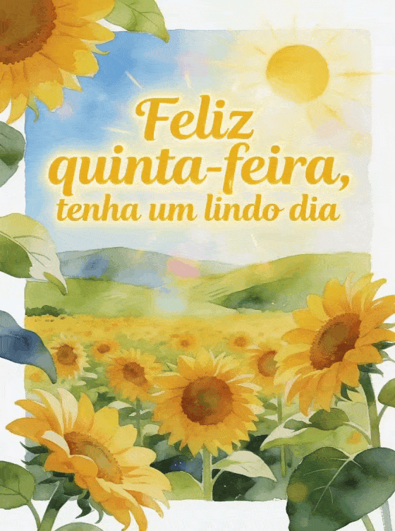 Envie uma mensagem luminosa de quinta-feira com um sol brilhante sobre girassóis e colinas verdes em aquarela. Veja também um feliz quinta-feira vermelho gif, um feliz quinta-feira beijos gif animado ou feliz quinta-feira a todos imagens.