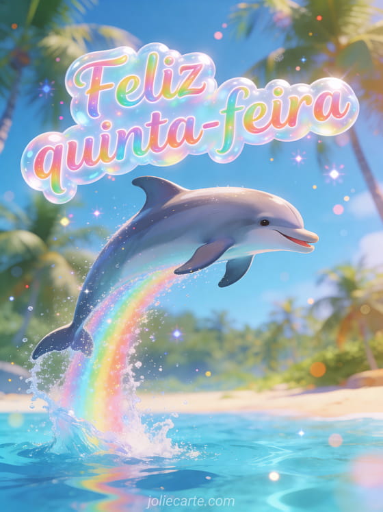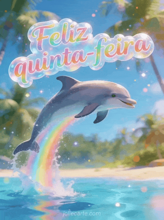 Envie uma saudação luminosa de feliz quinta-feira com letras bolha de brilho arco-íris e um golfinho alegre saltando da água azul cristalina perto de uma praia tropical. Veja também cartão animado feliz quinta-feira, boa quinta-feira beijinhos ou bom dia feliz quinta-feira cartão.