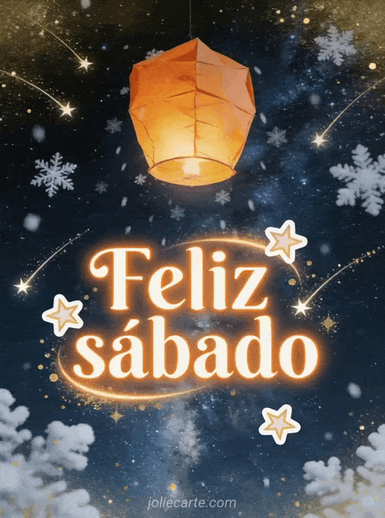 Envie um cartão mágico de feliz sábado à noite com letras laranja luminosas, estrelas cadentes, poeira dourada e uma lanterna de papel laranja flutuando em uma noite nevada e estrelada sob a Via Láctea. Veja também feliz sábado ensolarado, bom sábado bom fim de semana imagens ou feliz sábado e bom fim de semana.