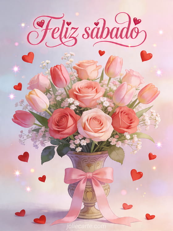 Compartilhe uma linda saudação de feliz sábado com um buquê de rosas e tulipas para iluminar o dia com carinho. Você também pode descobrir bom sábado café beijos, bom sábado e bom fim de semana e feliz ano novo 2017 bretão.