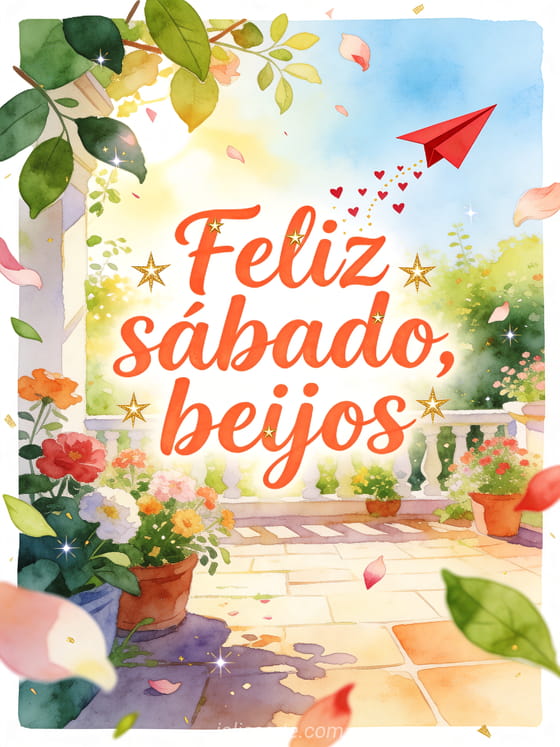 Compartilhe feliz sábado e beijos com um avião de papel vermelho levando confete de corações por um pátio ensolarado de jardim em aquarela. Envie esta mensagem carinhosa e descubra também feliz sábado meu amigo imagem, feliz sábado bom fim de semana gif ou bom sábado imagens animadas.
