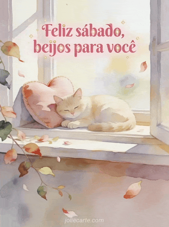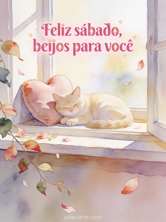 Envie uma saudação terna de feliz sábado com letras rosadas arredondadas, pontos dourados, um gato creme ao lado de uma almofada em forma de coração em um cantinho de janela luminosa, pétalas e folhas pendentes. Você também pode compartilhar feliz sábado imagens de inverno, bom dia e feliz sábado gifs ou feliz sábado minha amiga imagem.