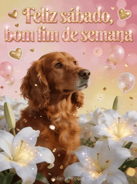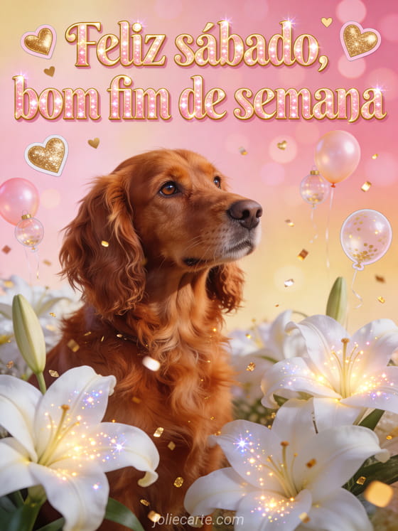 Compartilhe um cartão luminoso de feliz sábado e bom fim de semana com letras rosa-douradas, corações dourados, balões pequenos, lírios brancos brilhantes e um setter irlandês ruivo de olhar caloroso. Veja também bom dia feliz sábado Natal, estas feliz sábado imagens engraçadas ou uma mensagem de feliz sábado com gatos.