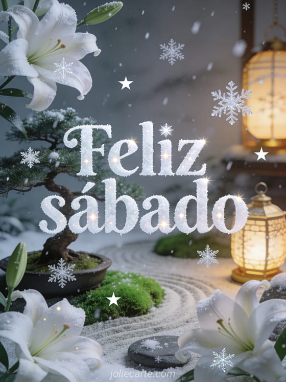Envie um cartão tranquilo de feliz sábado com letras brancas geladas, stickers de flocos de neve, um jardim zen com bonsai e musgo esmeralda, lírios brancos majestosos e neve suave iluminada por lanternas douradas. Veja também feliz sábado ensolarado imagens, feliz sábado minhas amigas imagem ou imagem animada feliz sábado.