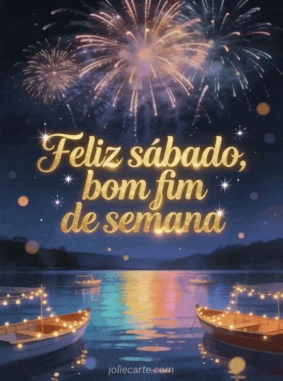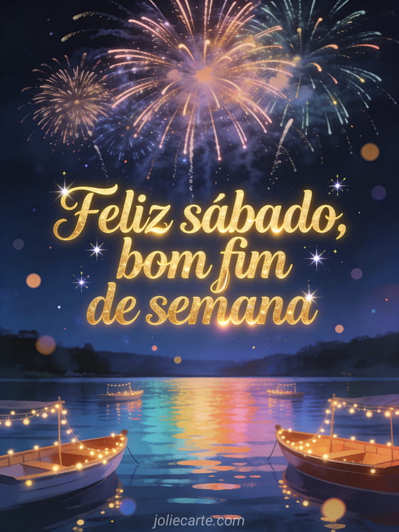 Compartilhe uma saudação brilhante de sábado e fim de semana com fogos de artifício coloridos sobre um lago, reflexos na água e barcos iluminados. Você também pode enviar bom dia feliz sábado ótimo dia ou feliz sábado bom fim de semana imagem.