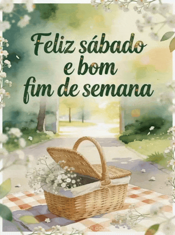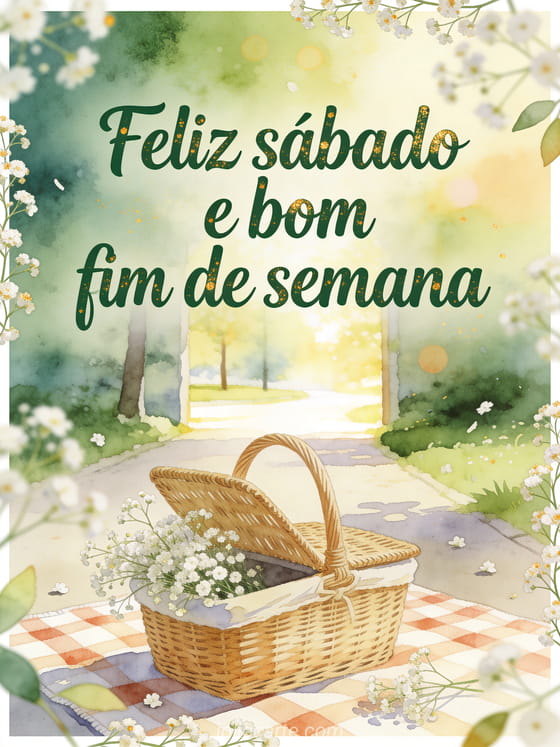 Deseje feliz sábado e bom fim de semana com uma cesta de piquenique em aquarela, um cobertor xadrez, flores leves de gipsófila e um caminho ensolarado no parque. Veja também um cartão de feliz sábado zen imagem, texto de feliz sábado ou imagem feliz sábado amigos.