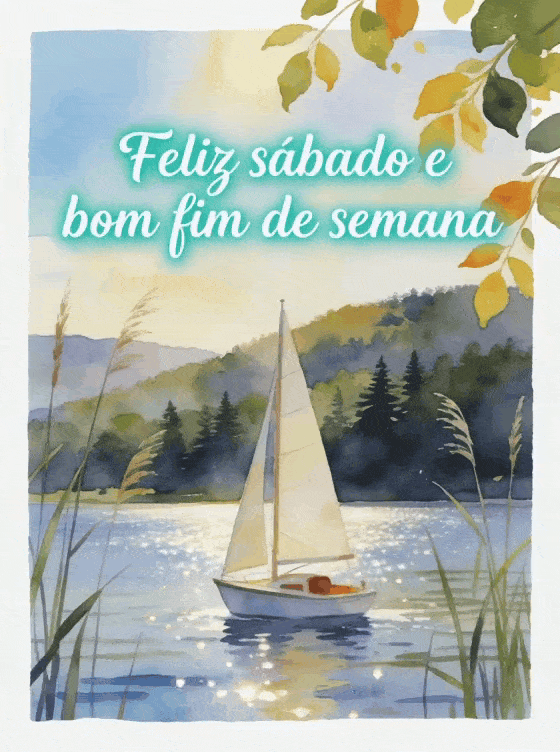Deseje feliz sábado e bom fim de semana com uma cena em aquarela de lago, um pequeno veleiro, colinas arborizadas, juncos e folhas brilhantes em calma ensolarada. Veja também um cartão de feliz sábado flores imagens, imagens brilhantes feliz sábado ou imagem para desejar um feliz sábado.