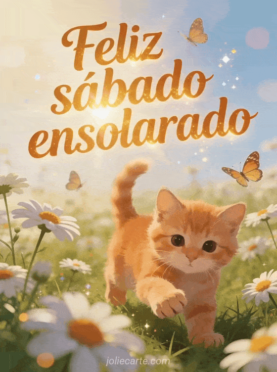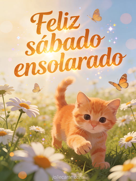 Compartilhe uma saudação luminosa de feliz sábado ensolarado com um gatinho ruivo adorável brincando em um campo de margaridas enquanto borboletas voam ao redor. Veja também uma feliz sábado minhas amigas imagem, uma imagem animada feliz sábado ou um gif feliz sábado para todos.