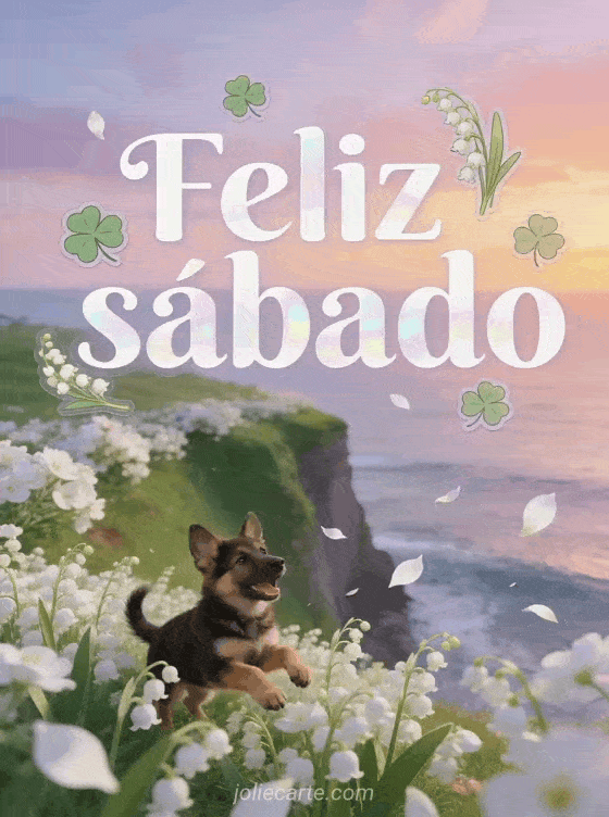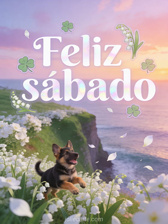 Envie um cartão engraçado de feliz sábado com letras brancas pastel, trevos de quatro folhas, lírio-do-vale, flores brancas delicadas em uma falésia verde sobre o mar e um filhote de pastor alemão brincalhão. Veja também feliz sábado com gatos, feliz sábado cartões bonitos ou olá sábado paisagem.