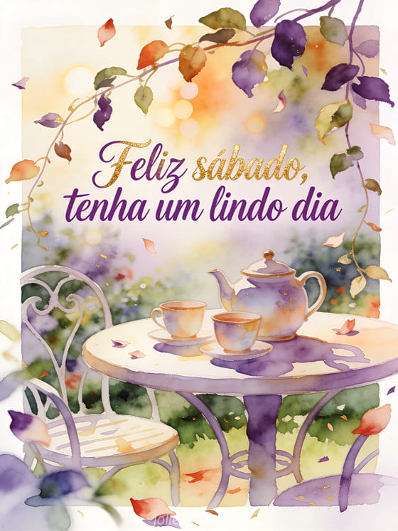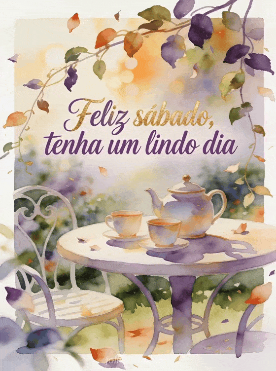 Envie uma saudação amigável de sábado com um bule de cerâmica, duas xícaras pintadas e uma mesa redonda de jardim em luz quente. Veja também feliz sábado romântico imagem, feliz sábado bom fim de semana imagens ou sábado bom dia gif.