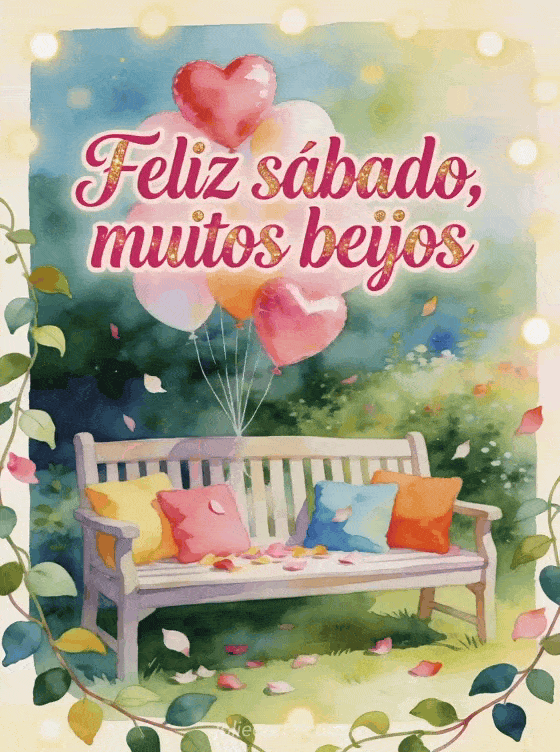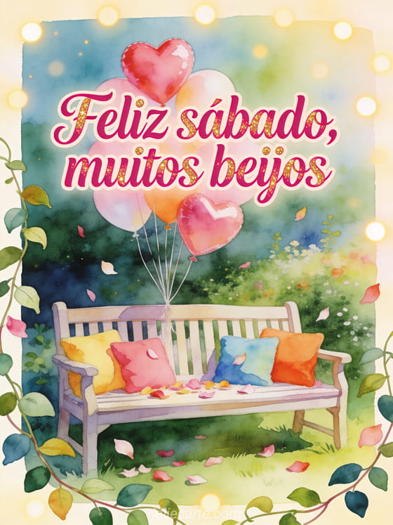 Compartilhe feliz sábado e muitos beijos com um cartão em aquarela que mostra um banco de jardim com almofadas coloridas, balões em forma de coração, pétalas e trepadeiras. Veja também um cartão de imagem grátis bom dia sábado, belas imagens de feliz sábado ou feliz sábado e bom fim de semana gif animado.