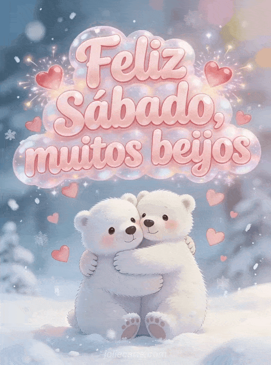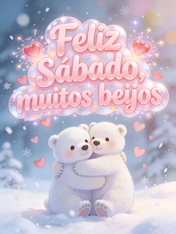 Envie feliz sábado muitos beijos com letras rosas arredondadas, corações flutuando, neve suave e um adorável filhote de urso polar dando um abraço acolhedor. Veja também um bela imagem de feliz sábado ou um feliz sábado bom fim de semana beijos.