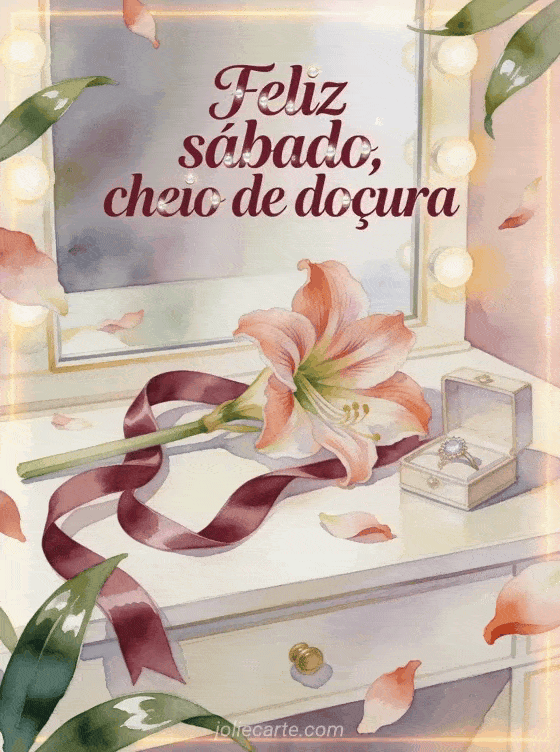 Envie um desejo suave de sábado com uma flor de amarílis, uma fita de cetim, um pequeno porta-joias e uma penteadeira iluminada. Veja também feliz sábado muitos beijos gifs, feliz sábado à noite gifs ou feliz sábado neve gif.