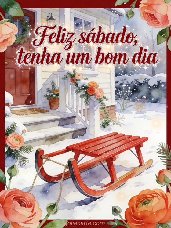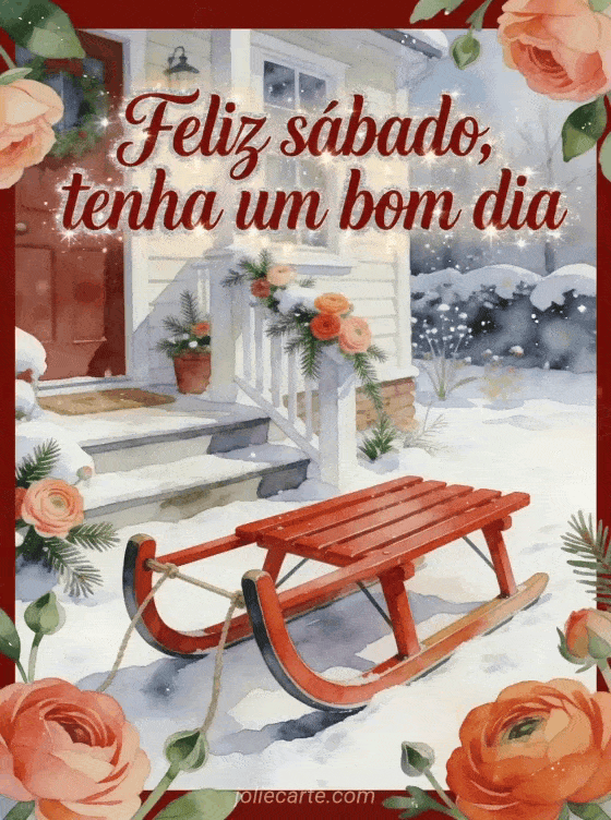 Envie feliz sábado neve gif com caligrafia vermelha profunda, um trenó vermelho ao lado de um degrau nevado de chalé, pétalas de ranúnculo e ramos verdes cruzando a borda. Você também pode gostar deste sábado tenha um bom dia gif, destas feliz sábado beijos imagens ou destas feliz sábado imagens de inverno.