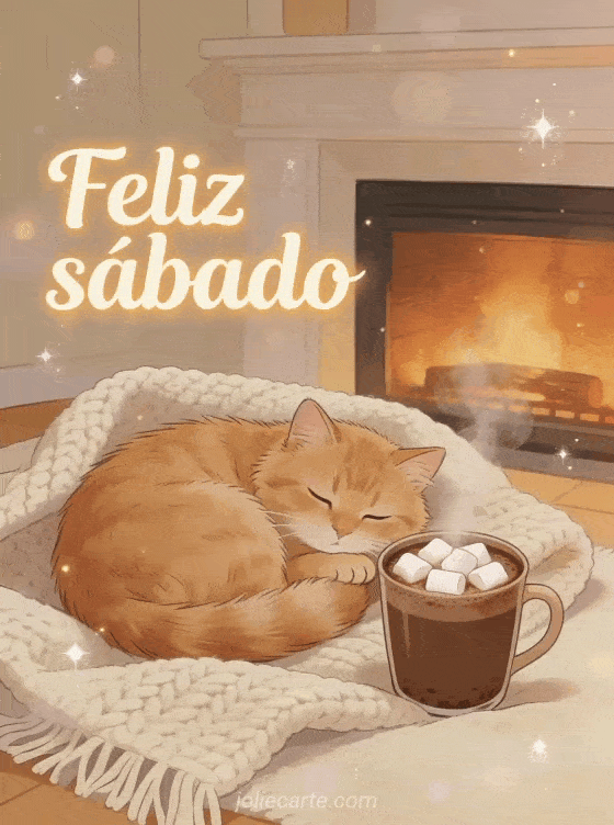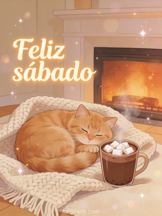 Envie uma saudação aconchegante de feliz sábado com um gato ruivo fofo enrolado em uma manta de tricô ao lado de chocolate quente com marshmallows e brilho de lareira. Veja também bom dia ótimo dia feliz sábado, feliz sábado beijos imagem ou feliz sábado imagem grátis.