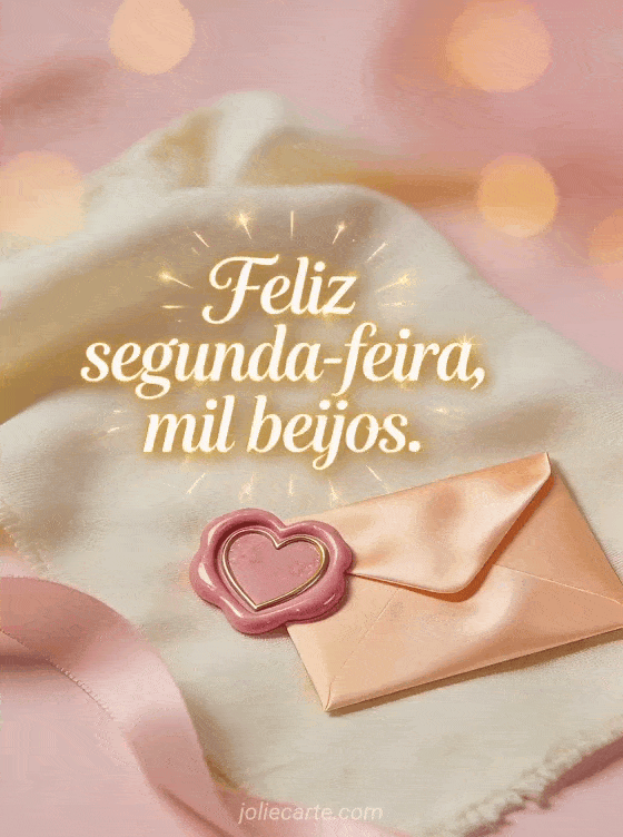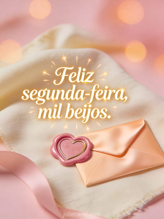 Envie uma saudação carinhosa de feliz segunda-feira com mil beijos, representada por um selo de cera em forma de coração e um envelope de cetim sobre um tecido quente. Veja também belas imagens bom dia segunda-feira, feliz segunda-feira ensolarada imagem ou gif cintilante de feliz segunda-feira cintilante.