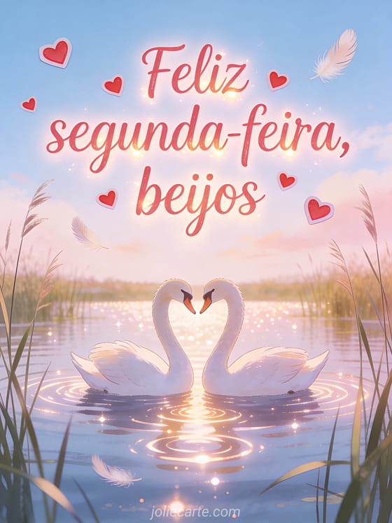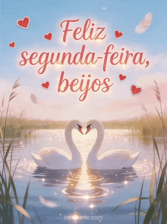 Envie beijos de feliz segunda-feira com dois cisnes deslizando juntos em um lago brilhante emoldurado por juncos, corações e penas suaves. Veja também feliz segunda-feira boa semana gifs, gifs animados feliz segunda-feira ou boa semana e feliz segunda-feira gif.