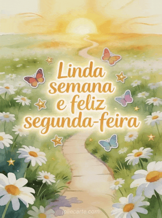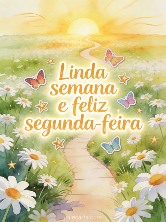 Envie linda semana e feliz segunda-feira com uma campina ampla cheia de margaridas, um caminho curvo rumo a um nascer do sol dourado, borboletas coloridas e estrelas. Veja também bom dia feliz segunda-feira e boa semana beijinhos, bom dia segunda-feira imagem ou boa semana e feliz segunda-feira imagem.