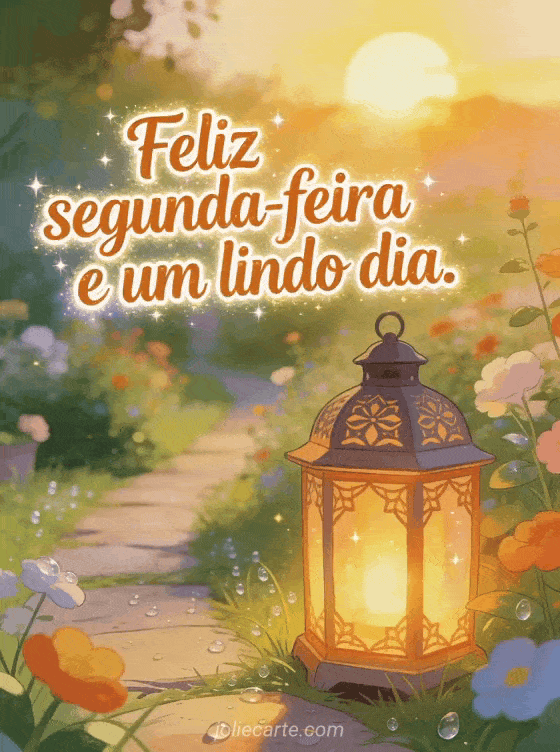Compartilhe um cartão virtual grátis de feliz segunda-feira com letras brilhantes, uma lanterna luminosa ao lado de um caminho de jardim ao amanhecer e cores alegres. Você também pode enviar gif feliz segunda-feira boa semana, uma boa segunda-feira imagem animada ou uma feliz segunda-feira boa semana imagem grátis.