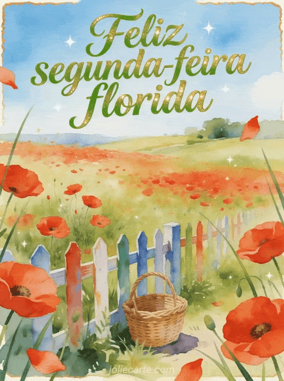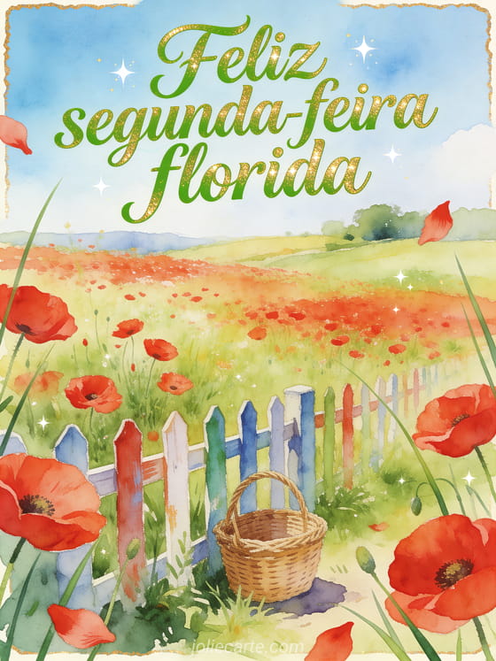 Deseje uma feliz segunda-feira florida com uma campina luminosa em aquarela, papoulas vermelhas, uma pequena cesta de vime e uma cerca pintada. Veja também um cartão de feliz segunda-feira nevada imagem, feliz segunda-feira bom começo de semana imagens ou feliz segunda-feira imagens gifs.