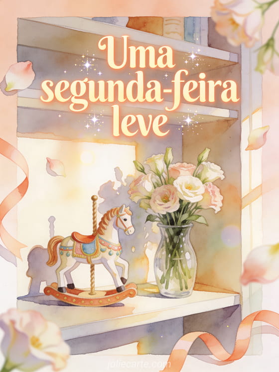 Deseje uma segunda-feira leve com uma cena em aquarela sobre uma prateleira, com um pequeno cavalo de carrossel, um vaso de lisiantos, fita enrolada e luz terna da manhã. Veja também um cartão de imagem feliz segunda-feira força, belas imagens para feliz segunda-feira e boa semana ou imagens de bom café de segunda-feira.