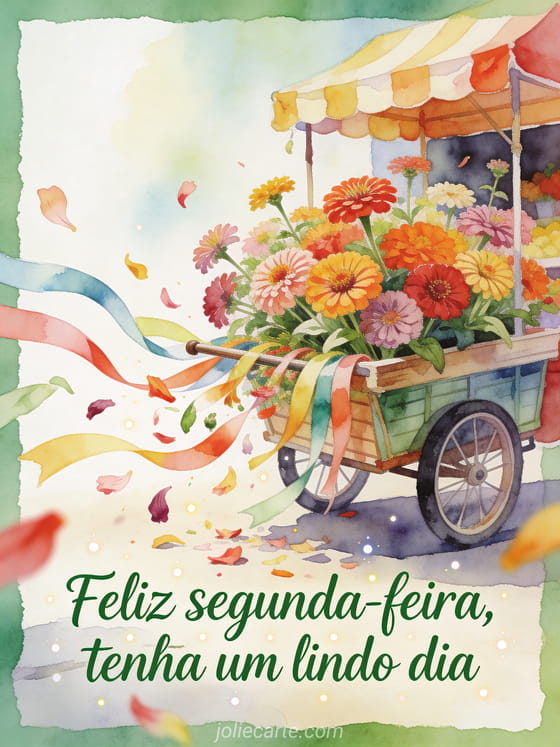 Comece a semana com um cartão de feliz segunda-feira mostrando uma carroça de mercado cheia de zínias, fitas e cor em aquarela. Veja também feliz segunda-feira gifs animados, feliz segunda-feira gifs ou feliz segunda-feira sol imagem.