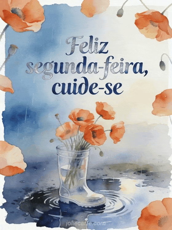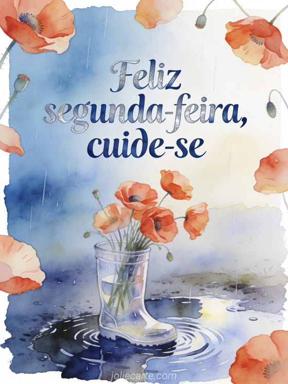 Envie uma mensagem de feliz segunda-feira cheia de cuidado, com uma cena de chuva em aquarela e papoulas luminosas. Veja também um feliz segunda-feira e boa semana gif animado, bom dia segunda-feira imagens ou uma imagem bom dia de segunda-feira.