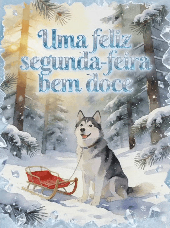 Envie uma mensagem terna de feliz segunda-feira com um cão husky alegre sentado ao lado de um trenó vermelho em uma clareira nevada de pinheiros, com agulhas congeladas e cristais de neve brilhantes. Veja também feliz segunda-feira bom começo de semana imagens, feliz segunda-feira imagens gifs ou bom dia de segunda-feira gifs.